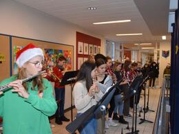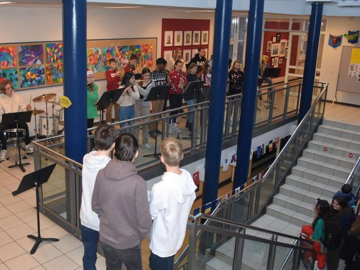 Einen sehr schönen musikalischen Gruß gab es heute in der 1. großen Pause von der Orchester/Band-AG unter der Leitung von Alexandra Buschermöhle. Zur Freude der Schüler und Lehrer erklangen coole Rhythmen, die sogar zum Mitklatschen animierten.