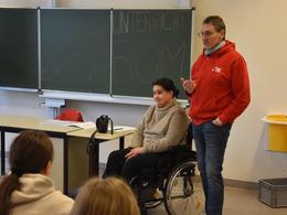 Gebannt hören die Schülerinnen und Schüler des Jahrgangs 11 zu, denn das, was da geschildert wird, ist gar nicht so weit weg von ihrer Realität. Einige von ihnen haben den Autoführerschein in der Tasche, viele sind gerade mit den ersten Fahrstunden angefangen. Das ist also genau die Zielgruppe, die Michaela Meyer als Unfallopfer und Achim Wach als Ehrenamtlicher von der Verkehrswacht erreichen wollen.