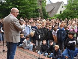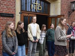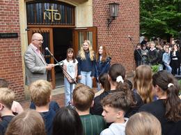 In diesem Jahr konnte Schulleiter Hartmut Drees vor der altehrwürdigen ND-Tür zahlreiche Ehrungen in den verschiedenen Bereichen vornehmen. Beim schulinternen Naturwissenschaftswettbewerb „Helden der Zukunft“ konnten zwei Schülergruppen aus dem 6. Jahrgang besonders überzeugen. Für die Untersuchung des Wassers auf die Belastung mit Mikrofasern aus der Badebegleitung bekamen Teo Benedek, Fritz Knorr, Heinrich Gardewin, Hinnerk Landwehr und Niklas Makselon einen Gutschein im Wert von 50€ für die Klassenkasse. Maja Dobelmann, Sina Winner, Mila Janssen und Amelie Günter freuten sich über den Hauptpreis in dem Wettbewerb. Für den Bau von natürlichen Wasserfiltern und die Untersuchung der Wasserqualität wurden die vier Jungforscherinnen mit einen Gutschein zum Besuch des „Universum“ in Bremen mit der gesamten Klasse ausgezeichnet.