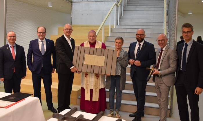 In diesem Sinne konnte Weihbischof Wilfried Theising also im anschießenden Wortgottesdienst den Grundstein, die Räume und alle Kreuze für die neuen Räume einsegnen, damit die gute Lernatmosphäre dann auch lange erhalten bleibe.