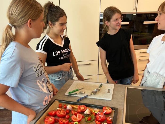 17 Kinder standen in der Lernküche der Marienschule am Herd. "Was gibt´s zu essen?" wird von ihnen in Zukunft bestimmt seltener gerufen, da sie nun selbst am Herd stehen können und leckere Pizza, süße Pfannkuchen oder italienische Pasta zubereiten können. Alina Wodniczak und Louisa Karnbrock zeigten den interessierten Kindern, worauf es in der Küche ankommt. Ich sage nur "Der Arbeitsplatz ist sauber zu halten."