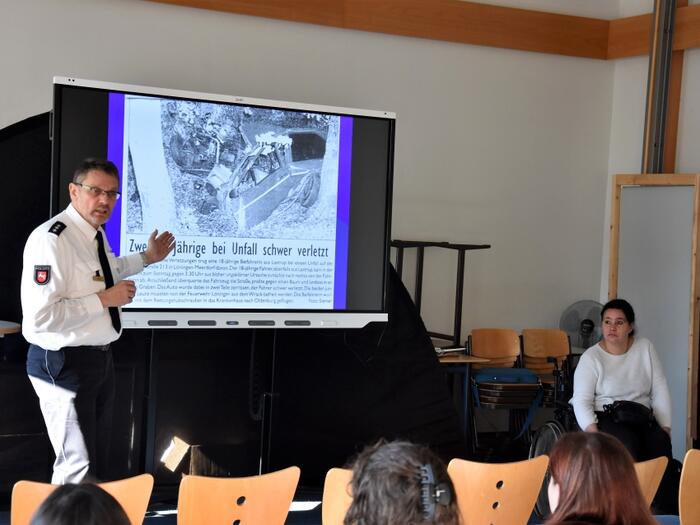 Es sind Fahranfänger im Jahrgang 11, die vor Achim Wach und Michaele Meyer sitzen. Einige haben den theoretischen Teil der Fahrprüfung, andere sogar schon Theorie und Praxis bestanden. Sie sind jetzt auf Cloppenburgs Straßen unterwegs - im Moment noch im so genannten "begleiteten Fahren". Sie sind genau die Zielgruppe, die der Polizeibeamte Achim Wach und Michaela Meyer, die bei einem Verkehrsunfall schwerste Verletzungen erlitt, erreichen wollen.