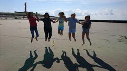 „Um 12.00 Uhr treffen wir uns wieder hier", sagten die Lehre zu uns. In kleinen Gruppen machten wir uns auf den Weg. Als die Stadtrally zu Ende war, gingen wir an den Strand. Dort durften wir leider nur mit den Füßen ins Wasser. Nach einer guten Stunde fuhren wir wieder zurück zur Jugendherberge. Dort wartete schon der nächste Spaß auf uns: Teamtraining. Wir gingen in die Turnhalle und trafen dort „Tüte".