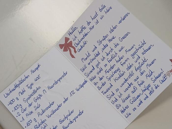Die YoungCaritas organisiert in der Adventszeit eine Aktion, bei der man handgeschriebene Weihnachtsgrüße an eine unbekannte Person verschickt. Hintergrund der Aktion ist, dass es in vielen sozialen Einrichtungen Menschen gibt, die das Weihnachtsfest nicht im Kreis ihrer Familie feiern können und die sich über einen persönlichen Gruß, der von Herzen kommt, freuen.