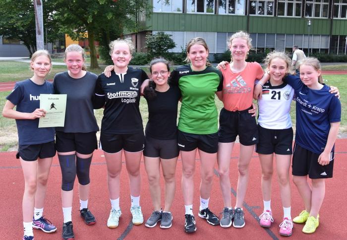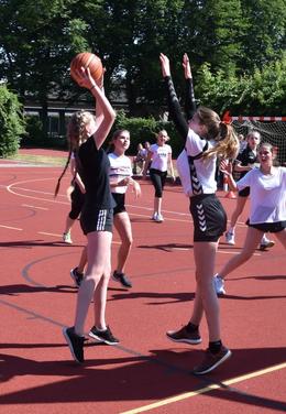 Bei den Mädchen wurde in zwei Gruppen zu vier bzw. drei Teams gespielt. Dabei zeigten sich die 8b in Gruppe A mit 19 Körben und die 8c mit 16 Körben in Gruppe B sehr souverän. Nachdem diese beiden Teams ihre Halbfinals jeweils mit 8:4 gewonnen hatten, kam es zum Finale der beiden spielstärksten und treffsichersten Teams. Nach neunminütiger Spielzeit siegte die 8b mit 8:2 gegen die 8c.