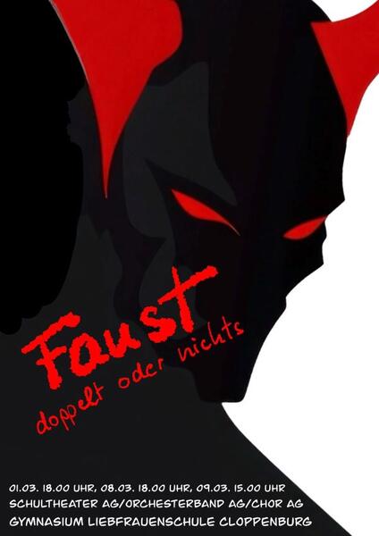 "Faust - Der Tragödie erster Teil" - das wohl berühmteste Stück deutscher Theaterkunst. Nicht umsonst ist Reclams Nr. 1 in der berühmten Literaturreihe mit den kleinen gelben Heftchen Johann Wolfgang Goethes Drama. Dieses Stück bringt die Theater AG der Liebfrauenschule in einer modernisierten, zugänglichen Form auf die Bühne in der Sporthalle. Zum Inhalt: