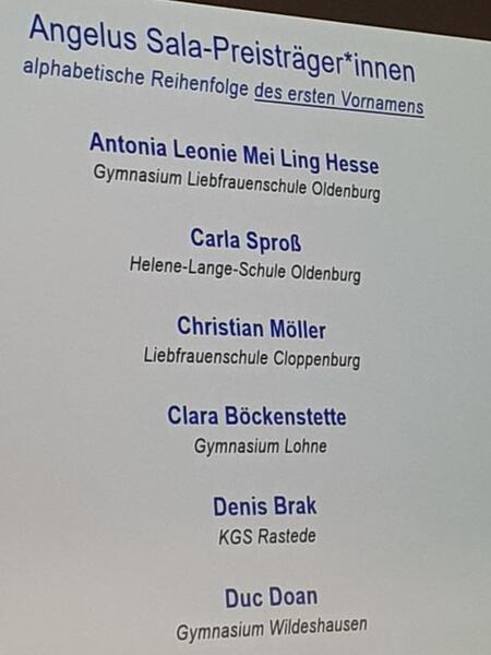 Im Rahmen der Entdeckertage, die von der Carl-von-Ossietzky-Universität Oldenburg durchgeführt wurden, fanden neben beeindruckenden Experimenten aus Physik und Chemie auch die Verleihung des Angelus-Sala-Preises statt. Mit dem Preis werden die jeweils besten Chemieschüler des 10. Jahrgangs ausgezeichnet. In diesem Jahr wurde auf Vorschlag der Chemiefachgruppe Christian Möller ausgezeichnet.