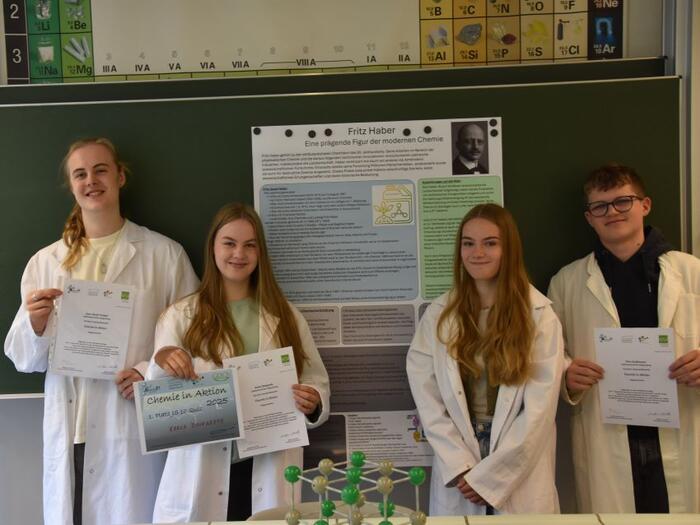 Finn Kraßmann, Aurelia Rommel (beide 9. Klasse) und Karla Dinkgrefe und Jans-David-Thoben (beide 10. Klasse) wurde als Team der Liebfrauenschule in den Wettbewerb "Chemie in Aktion" geschickt. In Zusammenarbeit mit dem Forschungszentrum Nordwest, dem Institut für Chemie der Carl-von- Ossietzky-Universität Oldenburg und der GdCH organisieren wir den Wettbewerb „Chemie in Aktion".