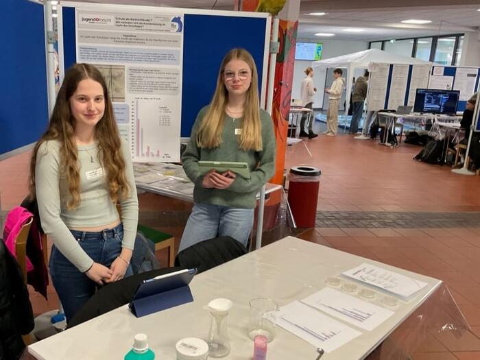 Rieke Nienaber und Hanne Wilken untersuchten die Veränderung der Keimbelastung im Laufe eines Schultages an verschiedenen „Hot Spots“ der Schule wie die Eingangstür und dem Treppengeländer. Probennahme und die Auswertung der Ergebnisse stellten sie dabei vor besondere Herausforderungen. Für ihre Idee und die Umsetzung ihres Projekts wurden sie mit einem Jahresabo der Zeitschrift GEOlino belohnt.