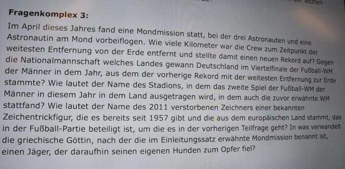 Zwei Dinge werden in dem Wettbewerb getestet und bewertet. Zum einen das genau Lesen. Die Fragen sind in Form von langen, verschachtelten Sätzen gestellt, die sehr schwer zu "entschlüsseln" sind. Oft ist man irritiert und fragt sich: "Was wollen die denn jetzt eigentlich wissen?" Die Fragen sind nicht "mal eben so" zu beantworten.