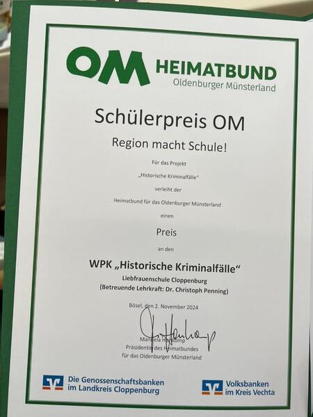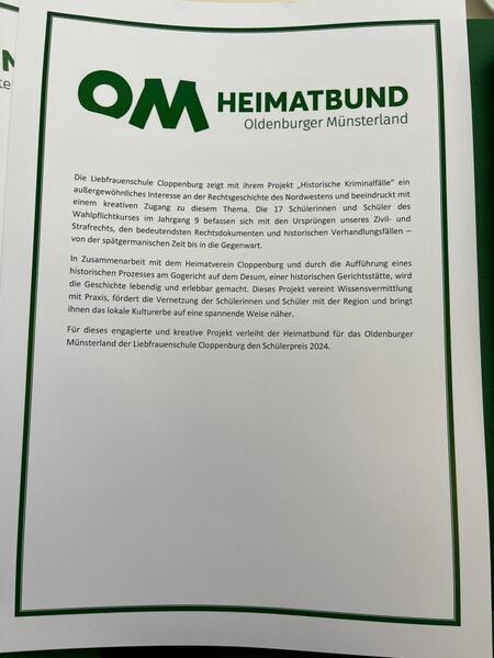 Ein Schwerpunkt war dabei das Gogericht auf dem Desum, wozu auch einige historische Gerichtsfälle nachgezeichnet wurden. Die Untersuchungsergebnisse fanden ein großes Echo bei der Jury des Heimatbundes für das Oldenburger Münsterland und wurde mit dem "Schülerpreis OM 2024" ausgezeichnet. Eine Abordnung der Schülerinnen und Schüler konnte nun in Bösel den Preis entgegennehmen. Herzlichen Glückwunsch!