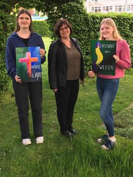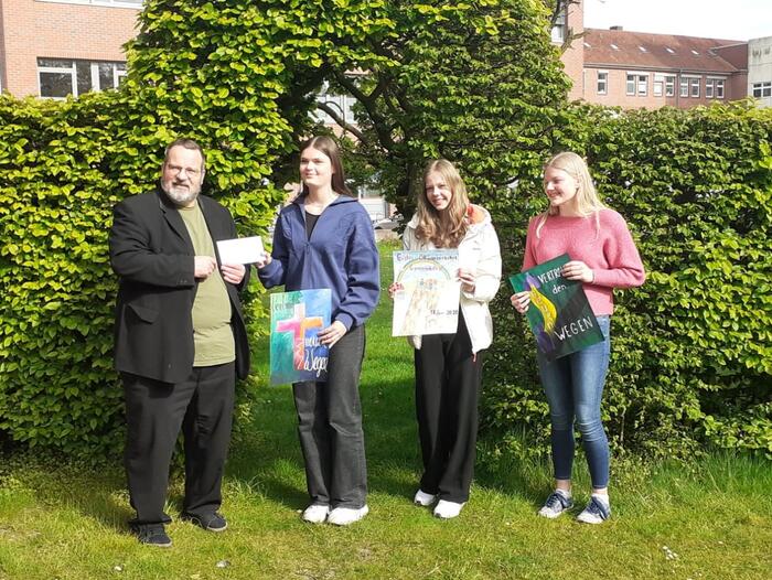Die Plakatentwürfe wurden im Rahmen der Preisverleihung von Pfarrer Andreas Pauly als kreativ, farbenfroh und inspirierend gewürdigt. Verbunden mit der Prämierung war ein Preisgeld für die Entwürfe. So wurde der erste Platz mit 150€ dotiert, der dritte Platz mit 50€. Über die hervorragende Platzierung freuten sich außerdem Kunstlehrerin Christel Behrends und Religionslehrer Paul Fröhle, die bei der Preisverleihung mit dabei waren.