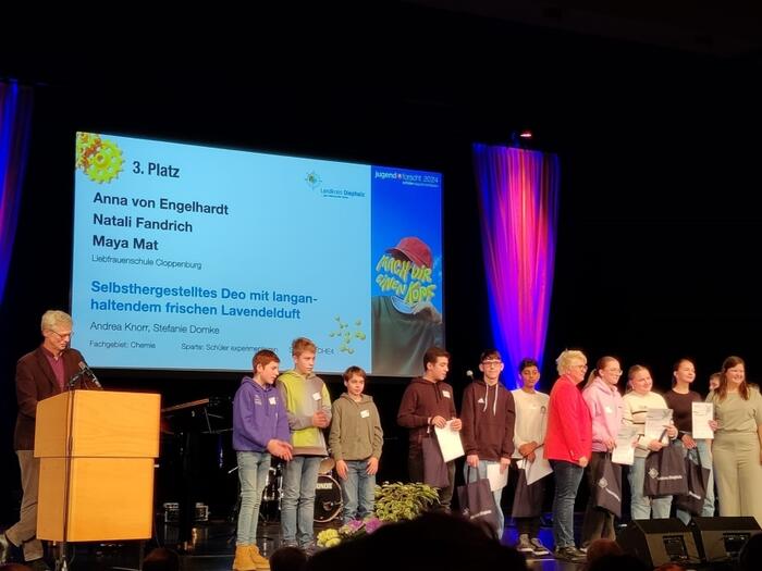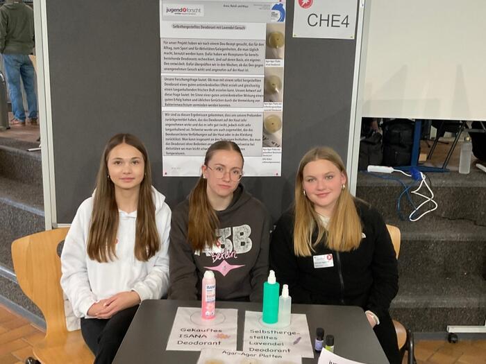 Überzeugen konnten die Jury die Projekte "Entwicklung und Untersuchung eines Lavendeldeodorants" von Anna Baroness von Engelhardt, Maya Mat und Natali Fandrich und "Mensch gegen KI - wer ist besser" von Malte Wichtrup und Tim Wieghaus. Beide Projekte wurden mit dritten Plätzen in ihren Fachgebieten belohnt.
