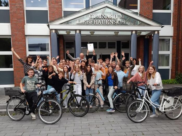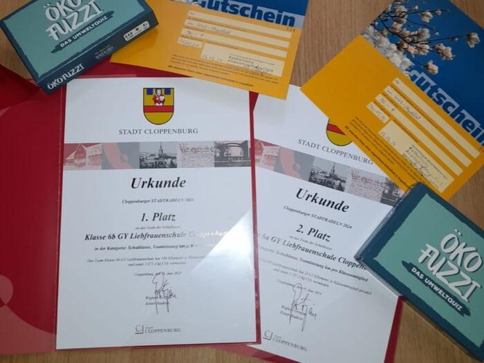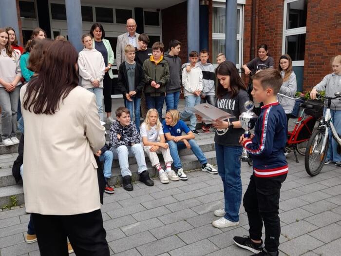 Nun ist es offiziell! Die Klassen 6a von Frau Völkerding und die Klasse 6b von Frau Lucassen sind die aktivsten Fahrradfahrer in der Stadt Cloppenburg. Nachdem es vor einigen Tagen eine erste Ehrung in der Stadt gab, folgte nun die offizielle Urkundenverleihung, zu der auch ein Gutschein und ein kleiner Sachpreis für jede Klasse gehörten.