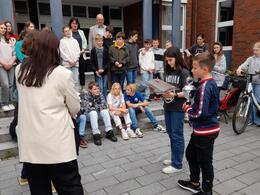 Die Klassen nahmen zusammen mit Schulleiter Hartmut Drees und den beiden Klassenlehrerinnen dies alles aus den Händen von Frau Juliane Gentner, Klimaschutzmanagerin der Stadtverwaltung Cloppenburg, in Empfang.