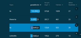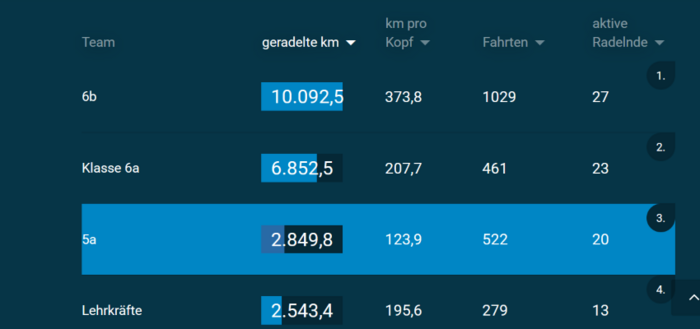 Die Klasse 6a erreichte den hervorragenden zweiten Platz und kam auf über 6500 Kilometer bei 23 Aktiven. Hier lag der Durchschnitt bei 207,7 Kilometern pro Radler.