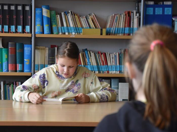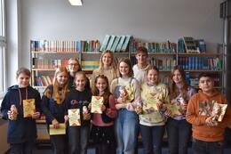 Marie Meyer hatte sich für eine amüsante Passage aus dem Roman von Alice Pantermüller und Daniela Kohl "Mein Lotta-Leben - Das letzte Eichhorn" entschieden, womit sie das Stechen um den Schulsieg erreichen konnte. Dort musste sie gegen die sehr guten Leserinnen Stella Ziemann und Tomke Marie Kramer bestehen und einen für alle drei unbekannten Text aus Sabine Ludwigs Roman "Hilfe, ich hab die Lehrerin geschrumpft" vortragen. Dabei konnte sie der fiesen Lehrerin Frau Schmitt-Gössenwein gekonnt eine Stimme verleihen und die Freude über die bevorstehenden Ferien im Roman lebendig rüberbringen.